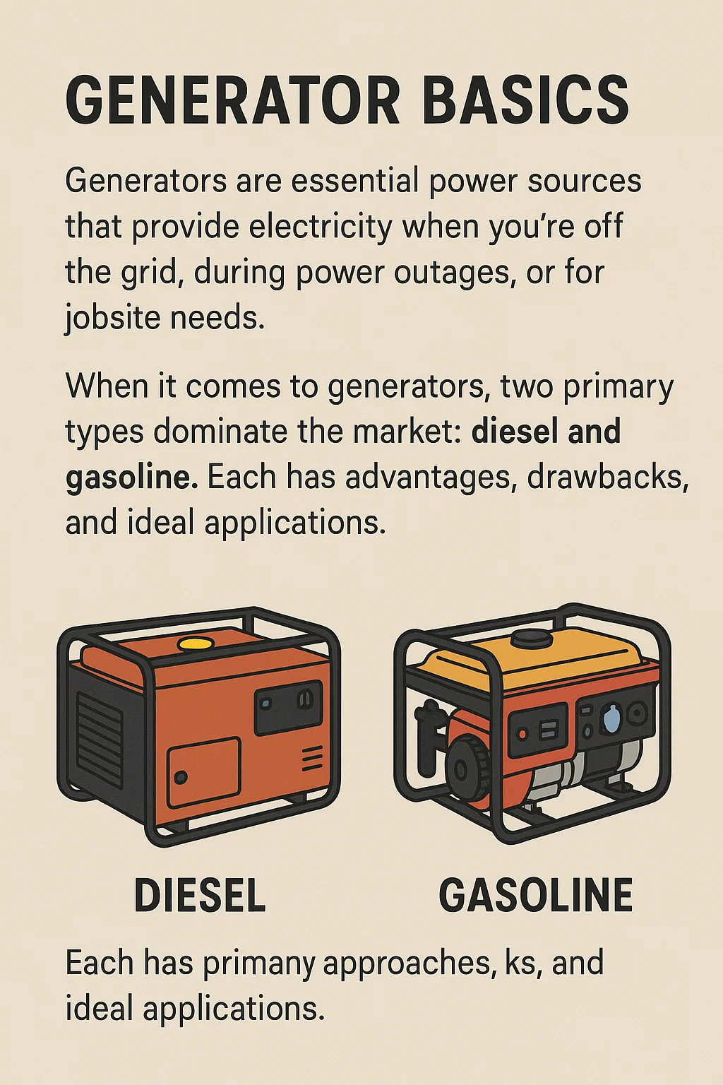 Dizel Jeneratörler : Dizel yakıt, özellikle kırsal alanlarda ve ticari kullanım için de yaygın olarak mevcuttur. Bununla birlikte, dizel genellikle daha büyük yakıt istasyonlarında veya kamyon duraklarında satılmaktadır; bu da daha kentsel veya yerleşim ortamlarında o kadar uygun olmayabilir.